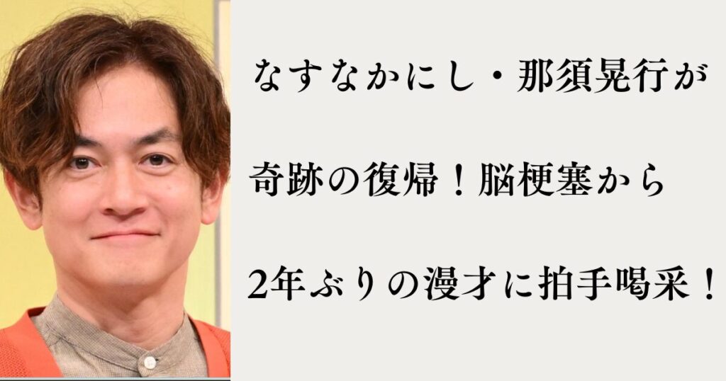 2023年12月、脳梗塞で倒れた那須晃行さん。 命をつなぐカテーテル手術、長いリハビリを経て――2025年10月、大阪の舞台に2年ぶりに帰ってきました。 いとこ同士の漫才コンビ「なすなかにし」。笑いの舞台で再び立つ2人の姿に、客席からは大きな拍手が鳴り響... -