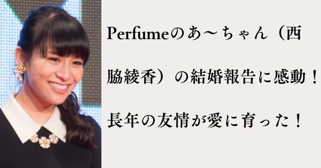Perfumeの**あ~ちゃん(西脇綾香)さんが11月11日、自身のInstagramで結婚を発表しました。 お相手はなんと、「昔からの友達であり、Perfumeや私のことを応援してくれていたファン」**という一般男性。 SNSでは「ファン婚」「Best Friend婚」というワード... -
