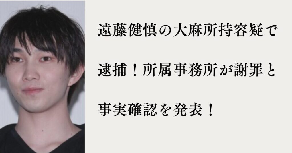俳優・遠藤健慎容疑者(24)が大麻所持の疑いで逮捕され、所属事務所「ヒラタオフィス」が公式サイトで謝罪コメントを発表しました。 芸能界では薬物事件が発覚すると、本人だけでなく、事務所や他の所属俳優へも大きな影響が及ぶのが通例です。 今回は、... -