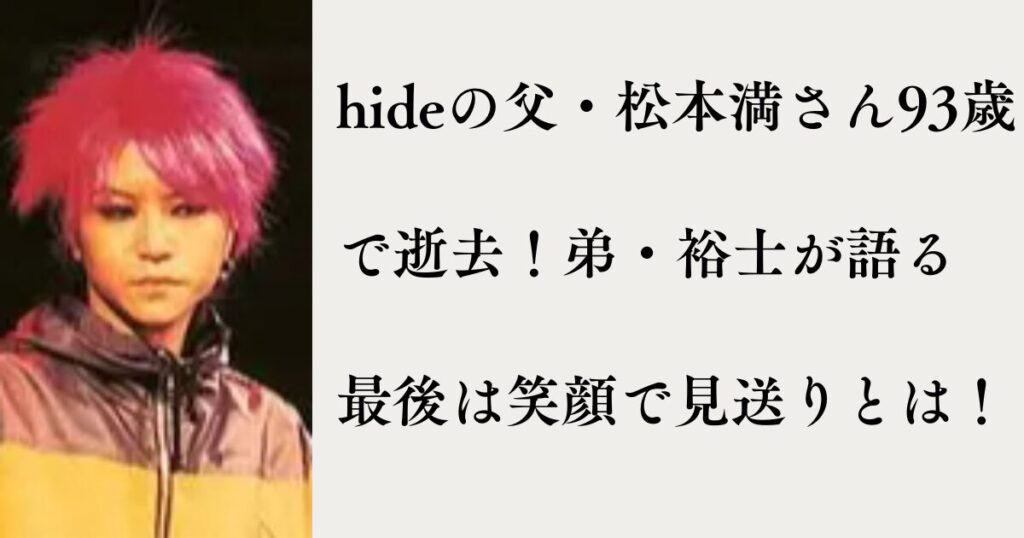 X JAPANのギタリストとして世界的に活躍した故hideさん。 その弟であり、兄の遺志を継ぎ活動を支えてきた松本裕士さんが、2025年10月1日に自身のSNSを更新し、実父・松本満さんの訃報を伝えました。 享年93歳。「兄のところへ旅立ちました」という言葉には... -