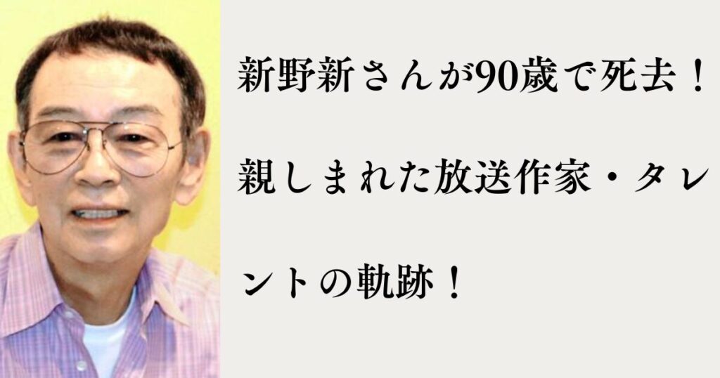 関西の放送界に大きな足跡を残した放送作家でタレントの新野新(にいの・あらた)さんが、2025年9月25日、大阪市内の病院で老衰のため亡くなりました。 享年90歳。 1950年代から放送作家として活動を始め、後にはラジオやテレビで“顔”としても活躍した新野... -
